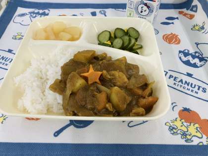 今日の献立は「チキンレバーカレーライス、きゅうりとコーンのサラダ、洋なし(カット缶)、牛乳」でした。
