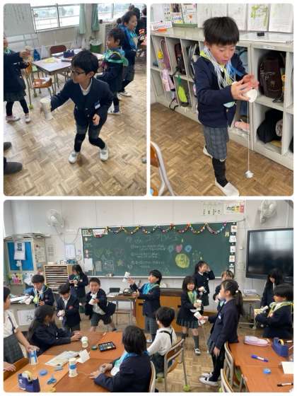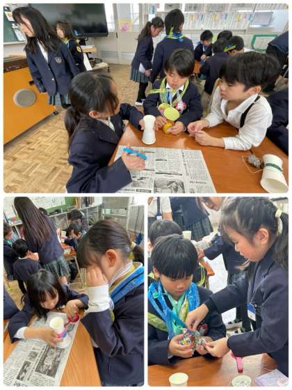 おもちゃで遊んだあと、教室では、紙コップを使ってけん玉を作りました。難しい箇所は助言し合いながら完成できました。互いに笑顔で楽しく遊ぶ姿があり、微笑ましかったです。