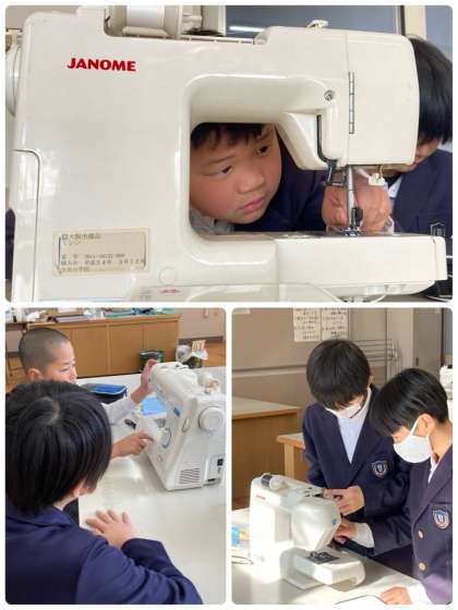 5年生は家庭科で、ミシンを使う学習が始まりました。各パーツの名前と使用方法を覚えながら、真剣な表情で取り組んでいます。糸を針に通すコツは、つかみつつあるでしょうか。