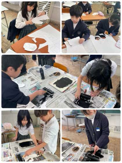 2年生は図工で版画をしました。まず、顔のパーツを画用紙に重ねて貼り、版を作りました。版にインクを付けたら、和紙をあてて刷っていきます。端までしっかりと刷り、はがした時に浮かび上がった絵を見てみんなうれしそうでした。