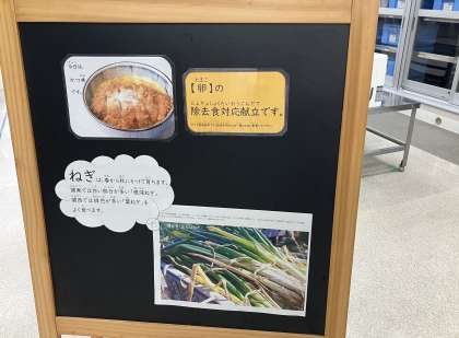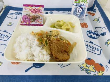 今日の献立は「カツ丼、キャベツの梅風味、いもけんぴフィッシュ、牛乳」でした。カツ丼は、「卵」の除去食対応献立です。