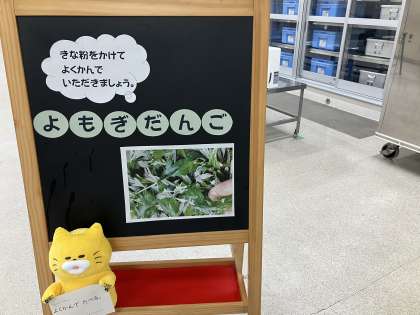 給食のよもぎだんごは、うるち米、もち米、よもぎから作られています。よもぎは、山や野原で自然に生えている春の野草です。やわらかな新芽をすりつぶして、だんごに入れます。今日は、あまいみつをからめたよもぎだんごに、きな粉をかけて春の和菓子をいただきました。