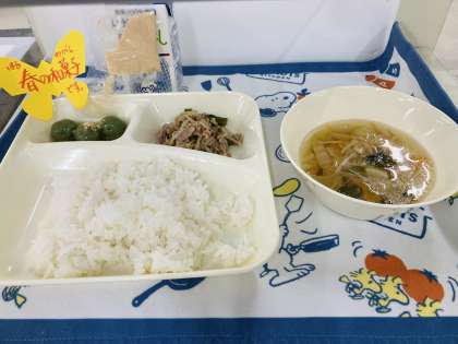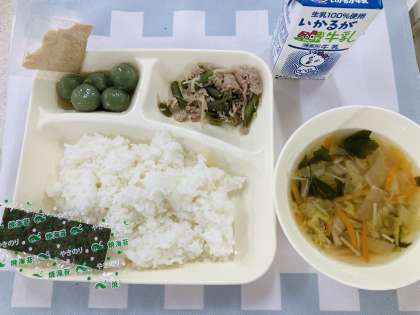 今日の献立は「豚肉と野菜のいためもの、五目汁、よもぎだんご(きな粉)、中学校:焼きのり、ごはん、牛乳」でした。