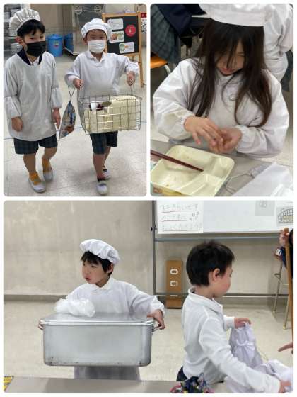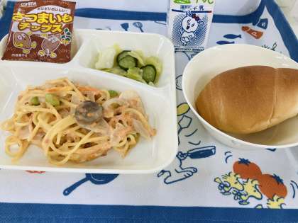 今日の献立は「さけのクリームスパゲッティ、キャベツときゅうりのサラダ、おさつチップス、ミニコッペパン、牛乳」でした。