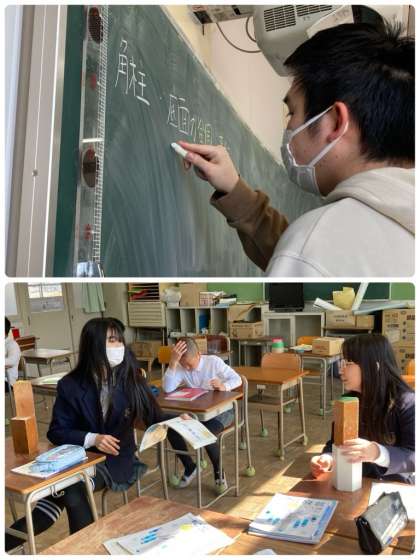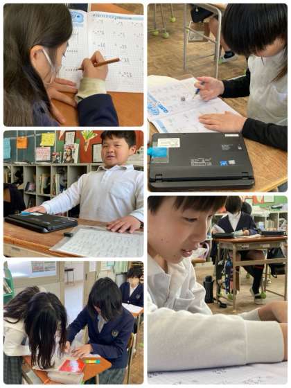 5年生の算数の時間の様子です。角柱については、具体物を用いて実際に確かめながら取り組みました。これまで学習してきたことの総復習のワークにものぞんでいます。良い形で5年生を締めくくれるよう、残り少ない日々を有意義に過ごしましょう。