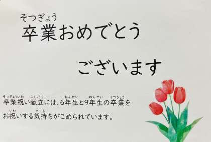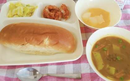 今日の献立は「あげどりのバーベキューソース、、カレースープ、キャベツとコーンのサラダ、フルーツゼリー、おさつパン、牛乳」でした。6年生の卒業をお祝いする気持ちと新たな進路へと羽ばたく9年生をお祝いする気持ちが込められています。