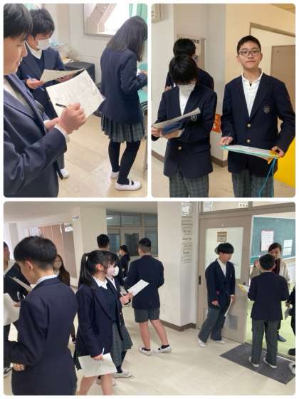 7年生が6年生を招いて、交流学習をしました。英語を用いて、中学校に関することを聞いたり、伝えたりすることを目的に、合同班で校内をまわりミッションをクリアしていきました。