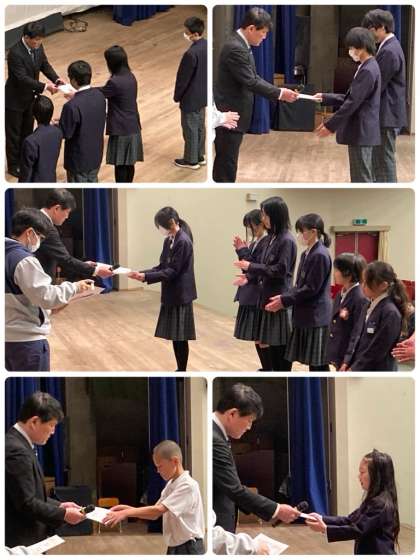 本日、修了式を行いました。まず、3学期に届いた賞状を校長先生に渡してもらいました。スピーチは3年生と生徒会代表が、この1年間をふり返って、成長が実感できたことを率直に話してくれました。