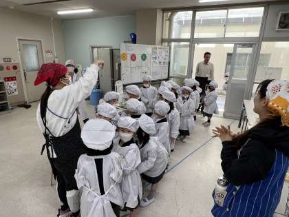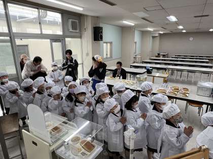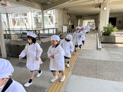 給食が始まりました。1年生にとって初めての給食でした。ワクワク、どきどきしながらランチルームに来ました。1年生はまだ配膳ができないので、6年生がお手伝いをしてくれます。