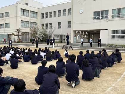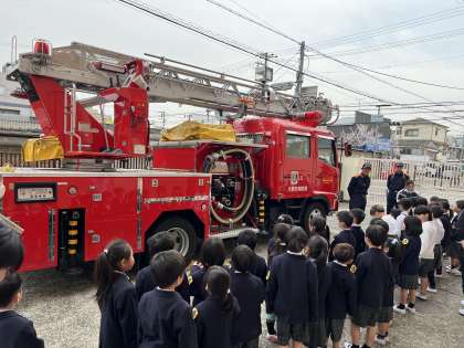 学校で火事が起きたことを想定して、避難訓練を行いました。消防署の方々が来校され、様子を見ていただきました。また、消火器の使い方を教えてもらいました。最後に1・2年生は、はしご車の見学をしました。