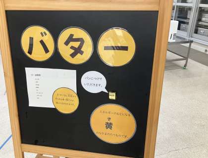 バターは、牛乳から作られる食べ物ですが、あぶらのなかまです。三色栄養では、エネルギーのもとになる黄色のグループになります。1年生の中には、はじめてバターを自分でつけて食べる人もいて、金色のキューブ型のバターが気になって仕方ないようすでした。先生の説明をしっかり聞いて、じょうずに食べることができていました。