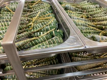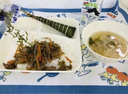 今日の献立は「きんぴらちらし、五目汁、ちまき、中学校:まっ茶大豆、牛乳」でした。大阪市の給食では、こどもの日の行事献立に【ちまき】がつきます。ちまきは、もち米や米の粉などで作ったもちを笹の葉につつみ、蒸して作る和菓子です。