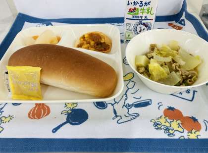 今日の献立は「豚肉と野菜のカレースープ煮、変わりピザ、ミックスフルーツ(かんづめ)、コッペパン、アプリコットジャム、牛乳」でした。ピザは、イタリア南部ナポリ地方の料理で、イタリアでは「ピッツァ」とも呼ばれています。小麦粉とイーストで作ったピザ生地に好みの具をのせ、オーブンで焼いた料理です。