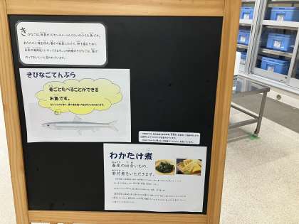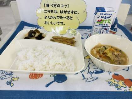 今日の献立は「きびなごてんぷら、みそ汁、わかたけ煮、ごはん、牛乳」でした。
