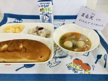 今日の献立は「金時豆の中華おこわ、まる天と野菜のうま煮、パインアップル(カットかんづめ)、おさつパン、牛乳」でした。