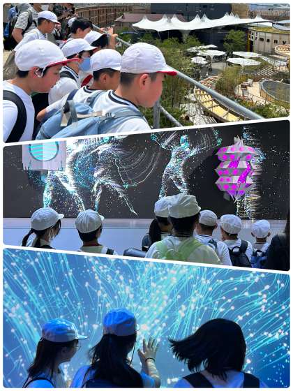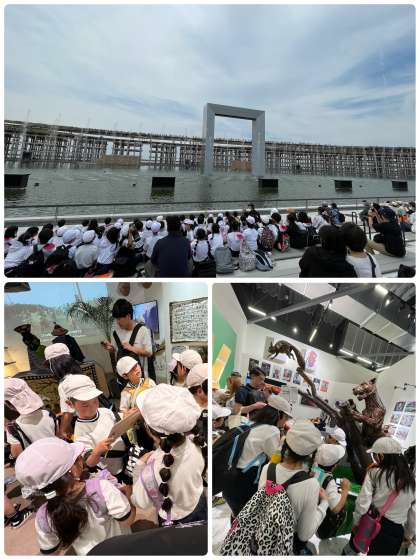 春の遠足に行ってきました。大屋根リングを上って移動して低学年・高学年に分かれてまわりました。低学年は、昼食後、噴水ショーを見て、コモンズ館でグループで協力しながらクイズに答えていました。高学年は「未来の都市」というパビリオンに入りいろいろな体験をしました。