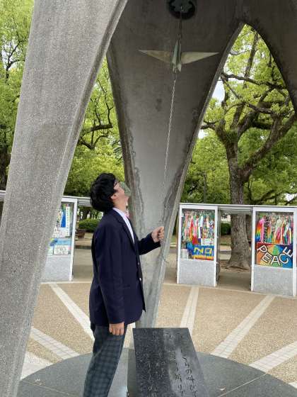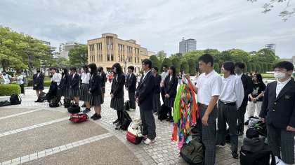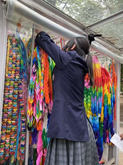 平和記念公園でのセレモニーの様子です。黙とうの後、千羽鶴を捧げました。この千羽鶴は9学年の児童・生徒・矢田7校の子連協のみんなで協力して折りました。