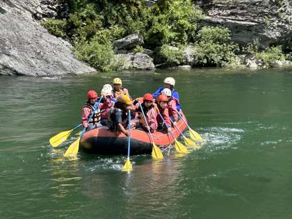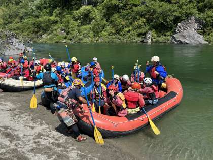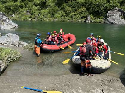ボートの漕ぎ方のレクチャーを受けています。吉野川はグレードが高いので楽しみです。
