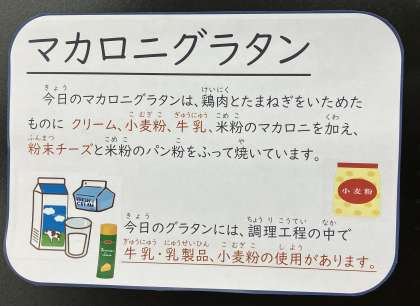 今日のグラタンには、調理工程の中で牛乳・乳製品、小麦粉の使用があります。