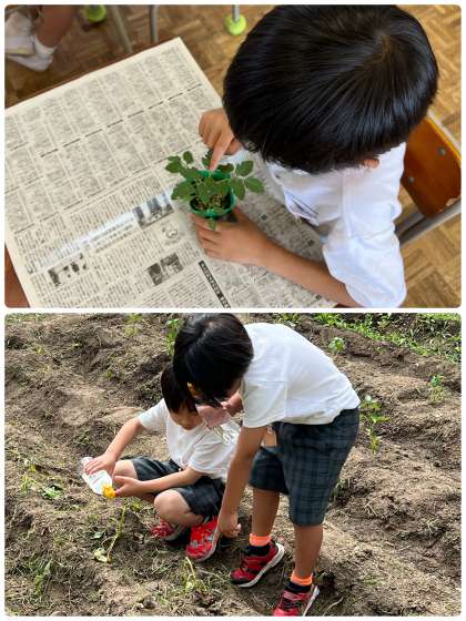 ミニトマトの苗を自分の鉢に植えて毎日、水やりをします。また、学習園になす、きゅうり、オクラ、ピーマン、さつまいもを植えました。