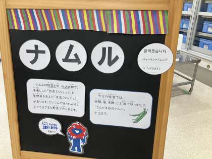 ナムルは野菜を使ったあえ物で、湯通しした「熟菜(スッチェ)」と生野菜をあえた「生菜(センチェ)」があります。だいこんやほうれんそうなど、さまざまな野菜で作られます。今日の給食では「さんどまめのナムル」が出ました。