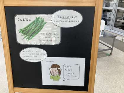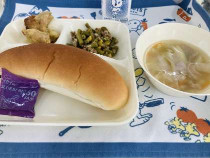 今日の献立は「鶏肉のカレー風味焼き、スープ、ツナとさんどまめのソテー、コッペパン、ブルーベリージャム、牛乳」でした。さんどまめは「さやいんげん」ともよばれ、いんげん豆が大きくなる前にさやごと食べる野菜です。1年に3度収穫できることから三度豆とよばれています。一番おいしく、たくさんとれる時期は6月から9月にかけてです。