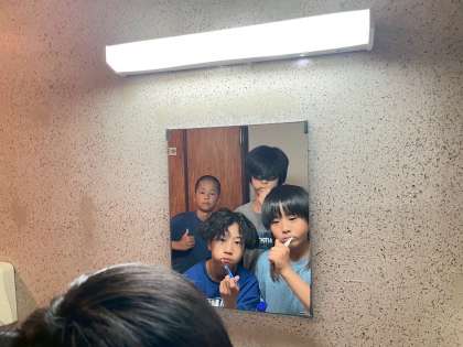 (下)歯みがきをして、明日の活動に備えてしっかり寝ます。おやすみなさい。また明日の朝から、活動の様子をお伝えしていきます。