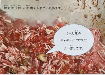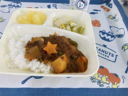 今日の献立は「ハヤシライス、キャベツとコーンのサラダ、りんご(カットかんづめ)、牛乳」でした。本来、ハヤシライスは、小麦粉とサラダ油などで「ブラウンルウ」を作り、とろみをつけています。
