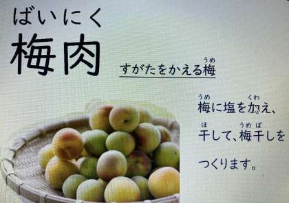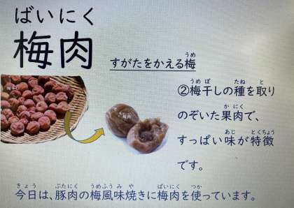 今日の献立は「豚肉の梅風味焼き、五目汁、さんどまめのごまあえ、ごはん、牛乳」でした。梅肉は、梅干しの種を取りのぞいた果肉で、すっぱい味が特徴です。梅肉をすりつぶして、和え物などに使うこともあります。