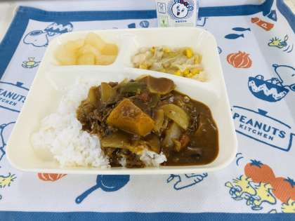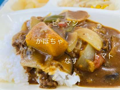 7/1の献立は「夏野菜のカレーライス、サワーソテー、洋なし(カット缶)、牛乳」でした。