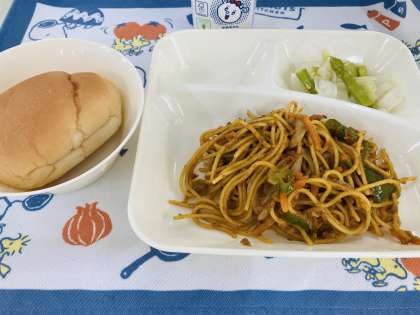今日の献立は「カレースパゲッティ、グリーンアスパラガスとキャベツのサラダ、発酵乳、ミニコッペパン、牛乳」でした。
