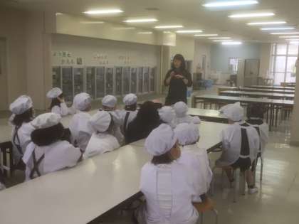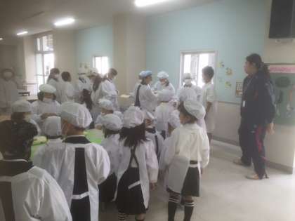小学校はじめての給食は「カツカレーライス」。白衣に着替えてみんなで準備します。しばらくの間は、6年生が準備を手伝ってくれます。お皿を置く場所や牛乳瓶を置く場所をしっかり聞いて落とさないように気をつけて準備しました。みんなが大好きなカレーライス、おかわりもしていっぱい食べました。