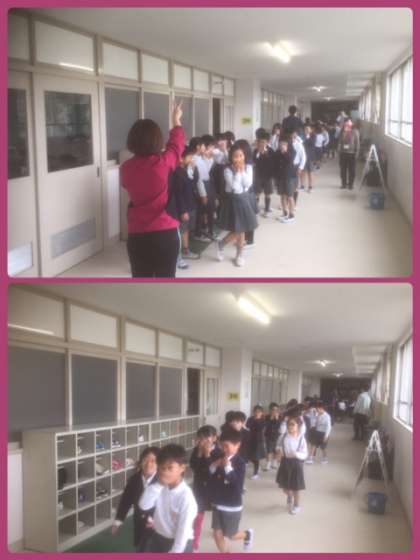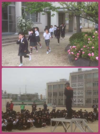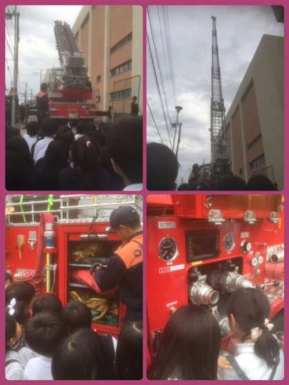 校内で火事が起きたことを想定した避難訓練を実施しました。新しい教室からの避難経路を確認し、指示に従って避難しました。その後、1〜3年生は、はしご消防車の見学をしました。消防車には、いろいろな道具が備えてあることを教えてもらいました。