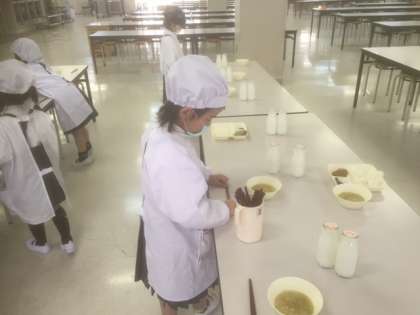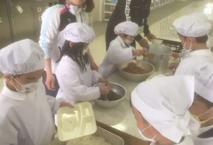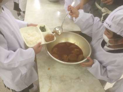 先週は、6年生が用意を手伝ってくれていましたが、今週からは自分たちで給食当番をします。今日の献立は、煮込みハンバーグ、コーンスープ、さんどまめのサラダ、ごはん、牛乳です。みんなで手分けしてがんばっています。