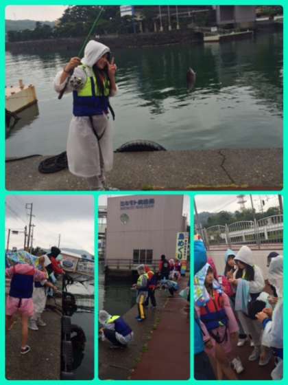 午後から少し雨が降ってきましたが、子どもたちは元気です。カッパを着て、釣り体験をしています。さっそく釣れました。「イェーイ!」