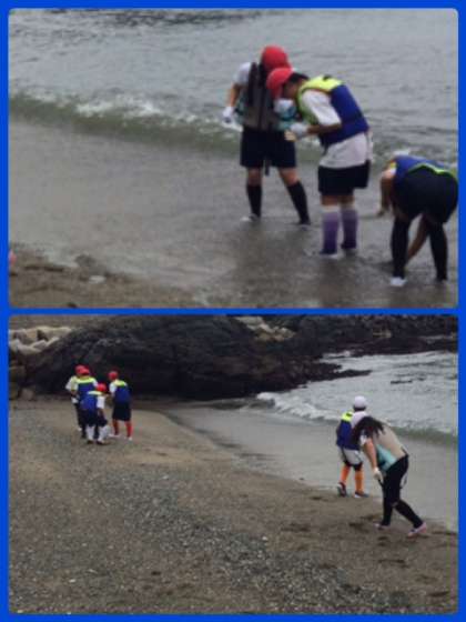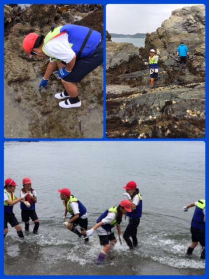 お昼の磯遊びの様子です。はじめのうちは足が濡れないようにと浜で貝殻を拾ったりしていた子も、だんだんと水の中へ入っていきました。