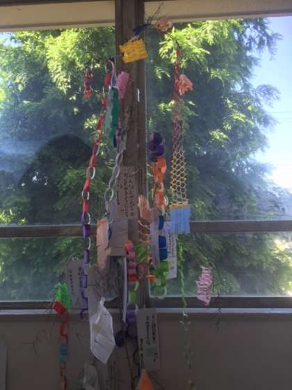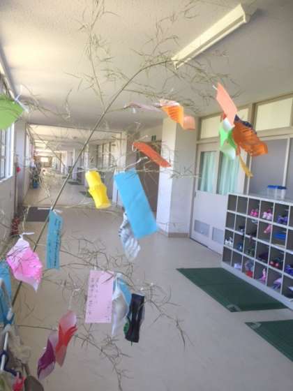 教室前には、それぞれの願いを込めた短冊や折り紙で作った飾りなどがきれいに飾られています。