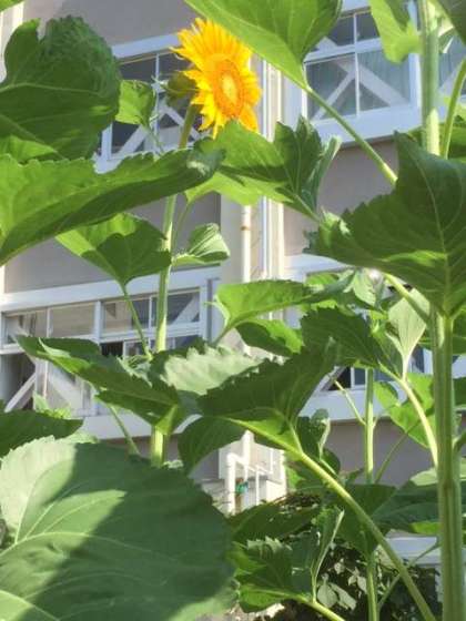 梅雨も明けて、いよいよ夏到来です。朝からセミの声も聞こえてきます。ぐんぐん伸びていた学習園のひまわりの花が元気に開きました。