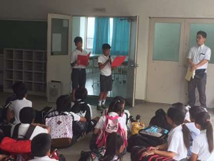 出発式では、教頭先生から林間学習の2つの目的「自然に親しむ」「集団で協力する」について話がありました。代表児童は、「いろいろなプログラムの中でもカレー作りが楽しみです」と元気に話していました。