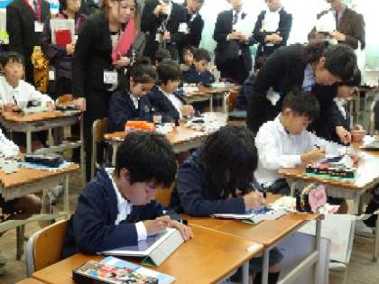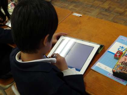 4年生の算数の授業では、「面積」の単元の学習を公開授業で実施しました。授業をするにあたっては、児童それぞれが、自分の考えを交流する中で、個々の自由な発想を大切にして、互いのよさや違いに気づき合い、認め合うことにより、集団での考えが深まるように進めたいと考えました。また、全体で意見を共有する前に、ペアで説明しあう時間を設け、より自分の考えをわかりやすく伝える工夫もさせました。本時の学習では、複合図形の面積の求め方について考えています。関西空港の写真を見て、第2空港島の形がL字型の図形になっていることから、課題「L字のような図形の面積の求め方を考えよう」を確認しました。iPadのマーキング機能を使って書き込みながら、それぞれの児童が自分の考えた方法で面積を求めました。次に、ペアでお互いの考えを説明し、それから全体で各自の考えを共有しました。最後に、学習した求め方を使って、関西空港の第2空港島の面積を求めました。今回の公開授業を、とてもたくさんの方が見に来られていて、子どもたちは緊張していましたが、精一杯がんばっていたと思います。「児童たちがタブレットの操作に慣れていて、うまく使いこなしていることに驚きました。」「電子黒板に問題を大きく写してから児童たちのiPadに配信しているのを見て楽しそうだと感じました。児童たちもとても集中できていたと思います。」「隣の友だちと自分の考えを教えあうのは、説明する力・伝える力がついて良いと感じました。」「自分の考えを他者に説明するということで、児童の理解は確かなものになると感じました。」等々の感想をいただきました。詳しい学習内容を知りたい方は指導案(ここをクリック)をご覧ください。