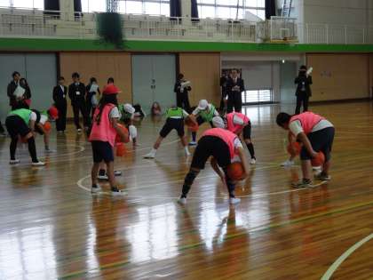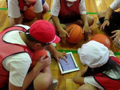 5年生の体育の授業では、「バスケットボール」の単元の学習を公開授業で実施しました。連携プレーからシュートが決まったときが、バスケットボールの楽しさをより味わうことができる時だと思います。シュートの成功が直接勝敗に関わるので、多くの児童がシュートを決めたいと感じる競技ですが、ワンマンプレーで一人だけシュートを決めてもチームみんなで喜ぶことはできません。それぞれが役割を全うし、相手をかわしてシュートに結びついたときに喜びや達成感や成就感を共有できるのだと思います。そこで、本時の課題を「コンビネーションによるパスからシュートまでの作戦を立て、ゲームを試そう」としました。作戦・ゲームの記録・分析・個人やチームの課題を、学習カードやiPadの「Corch Note」という作戦板コンテンツを使いながらチームで話し合いました。そして、練習ゲームを行い、振り返りをした後に対抗ゲームをしました。「アプリを操作しながら作戦を考える子どもたちが大人に見えました。」「iPadを使うことで、一人一人が試合中の自分の役割を空間把握できるので、実際に試合が始まるとボールに集まってしまうといったことが起きなかった。」「戦術をチームで考えている時に、生き生きと意見を出し合う姿にビックリしたと同時に、それぞれの意見を言いやすい雰囲気が作れるんだなと思いました。」等々の感想をいただきました。詳しい学習内容を知りたい方は、指導案(ここをクリック