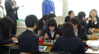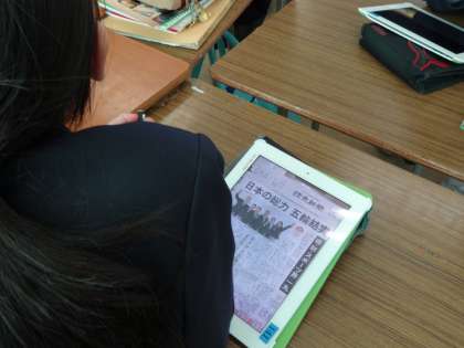 8年生の国語の授業では、NIE実践「新聞の言葉から語彙を広げよう」の内容で公開授業を実施しました。今回の学習では、生徒の自由な発想を促し、それを表現させることに重点を置きました。タブレットや電子黒板を用いることで発表への苦手意識を小さくし、お互いの考えをスムーズに交流できることをねらいとしました。また、新聞を活用することで豊富な情報から多様な語彙に出会う機会ともなればと考えました。「キーワード」を含む新聞記事を読み、実際に使われている「動詞」をピックアップしていきました。「SKY MENU」を使うことで、タブレットに記入された各班で見つけた「動詞」が全体で共有しやすくなりました。各班から見つけた「動詞」について発表した後、その「動詞」を使って自分の身近な体験と関連のある例文を作りました。最後に、体験に関するエピソードを入れて、作った例文を発表・交流しました。「語彙を広げるのに、効果的な学習だと思いました。」「新聞という素材を使用し動詞を見つけることで、日常おきているニュースを身近に感じさせ、そして、それを自分たちの言葉につなげるという取り組みは、生徒にとって、話し言葉ではない言語を知るのに、とてもわかりやすいと思いました。」「興味関心を引くためのツールとしては、まちがいなくICT機器は効果的だと思いました。」等々の感想をいただきました。詳しい学習内容を知りたい方は指導案(ここをクリック