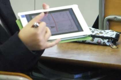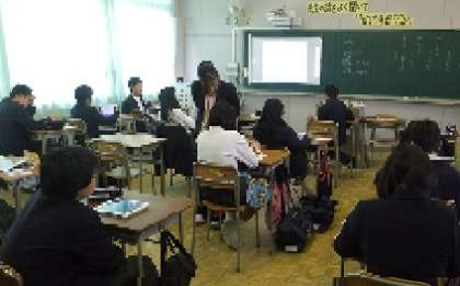 7年生の国語の授業では、古典「竹取物語」の単元の学習を公開授業で実施しました。古典を苦手だと感じる生徒が、少しでも興味を持ち意欲的に学んでくれるように、また、なじみのない古語や現代語では用いるものの意味の異なる古語の理解を助けることができるようにと考えてiPadを活用しました。まず最初に音読をした後、イメージした情景をiPadをに描いて互いに共有しました。違いのある絵を比較しながら、絵と語句のつながりを1つ1つ確認していきました。「国語の古文というと書いて覚える授業のイメージだったので、ICT機器を使うことで、このような授業展開ができるのかと驚きました。」「生徒の考えを自由に書いてよいというのが楽しそうでよかったと思います。電子黒板に写すことで、他の生徒のヒントにもなるし、写してもらった生徒はうれしいだろうと思いました。」「古典に興味のない生徒の注意をひいて顔をあげさせる場面も見受けられました。交流の手立てとしてのiPad使用の有効性に気づくことができました。」等々の感想をいただきました。詳しい学習内容を知りたい方は指導案(ここをクリック