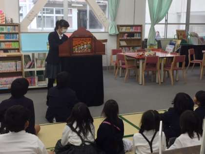 12月1日から15日までを読書週間として、読書に親しむ取り組みを行います。この期間、昼休みに中学校図書文化委員会の委員が紙芝居の読み聞かせを行います。今日は、「世界一大きなケーキ」のお話です。低学年の児童から中学生までいっしょになって聞いていました。明日からも毎日行います。どんどん見に来てください。