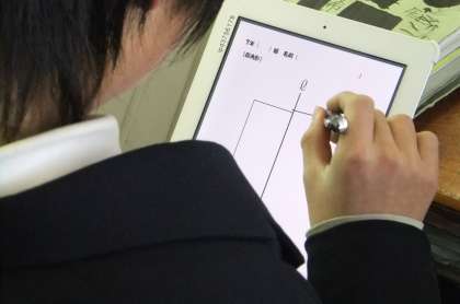 今回の授業は、まず、「四角形を直線のまわりで1回転させると、どんな立体になるだろう。」という例題を、前のスクリーンに映写するとともに、全員のiPadに配信しました。ます、iPadに書き込みながら、各自で考え、みんなの考えを全員で共有しました。それから、電子黒板で実際に図形を動かしてできる立体を確認しました。その後、見取り図を書くときの約束も確認しながら、様々な形について考えていきました。最後は、自由な発想で、「これを回転させたらどんな立体なるかな?」と生徒たちが思う好きな図形を書かせて回転させてみました。「ICTを活用してどの子も興味を持って学習している姿が印象的でした。」「ICTの活用によって理解できていない部分がよくわかったり、発表する際に便利だということを感じた。」「言葉では伝わりにくい回転体の説明には、ICTは有効だと感じました。」等々の感想をいただきました。詳しい学習内容を知りたい方は指導案(ここをクリック