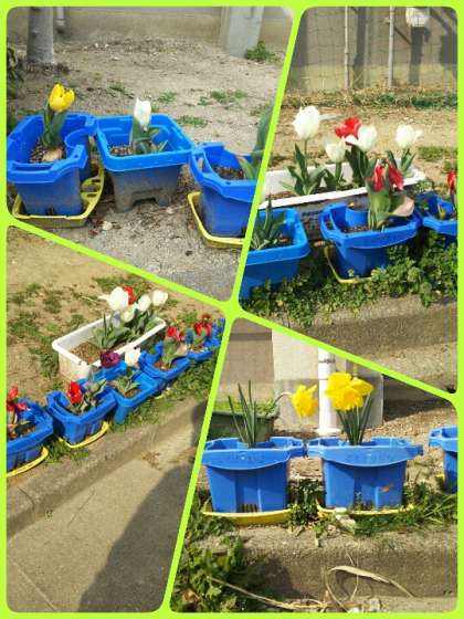 春の暖かい日差しとともに、外から子どもたちの元気な声が聞こえてきました。中庭をのぞいてみると、いきいき活動の子どもたちが仲良く遊んでいました。その横では、1年生が植えたチューリップと、2年生が植えたスイセンの花も咲いています。