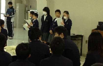 最初に、保健給食委員会より、「給食クイズ」が出題されました。問題は三択で、みんな手を挙げて指で答えを示していました。当たった時は、ちょっと得意そうでした。クイズの内容を紹介しますので、答えは、ご家庭でお子さんに聞いてみてください。