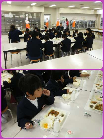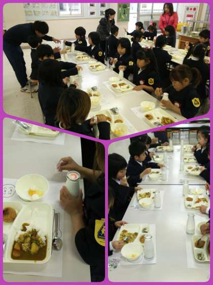 1年生の待ちに待った初めての給食。入学お祝い献立で、カツカレー・ミニフィッシュ・フルーツしらたまです。おかわりした子も、たくさんいました。これから毎日、いっぱい食べて、元気に成長していくことを願っています。