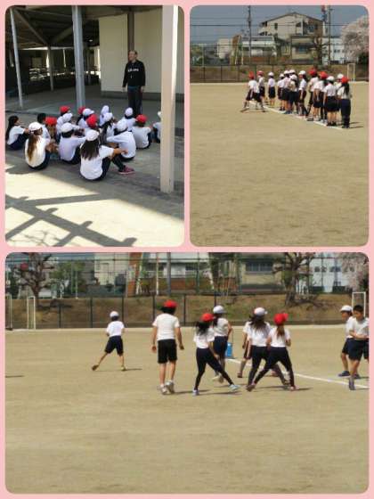 暖かい気候の中、5年生が運動場で陸上の授業をしていました。