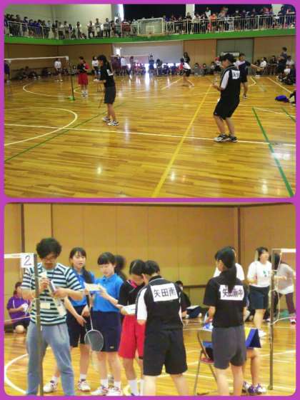 本校体育館で、中学校バドミントン部の春季総合体育大会の予選1日目が開催中です。息の合ったダブルスの試合の様子です。